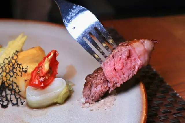 牛排色澤是漸層粉嫩至碳烤後的肉色,油花與肉均勻分佈,肉質軟嫩帶有口感及肉汁,沾點海鹽就可明顯感受到肉的鮮味及肉香味。