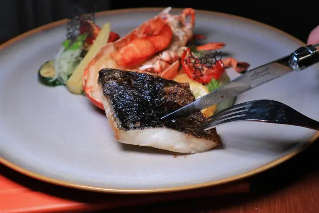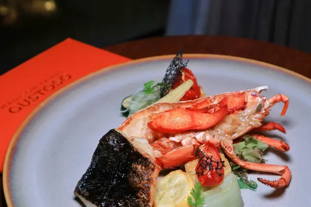 一整隻嚴選波士頓龍蝦佐上青石斑魚,色彩鮮豔炫爛,