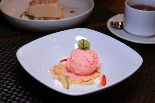 一球草莓冰淇淋搭著碎餅乾吃,甜甜涼涼的。