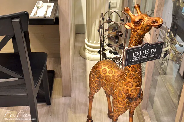 我個人是入座沒多久出去拍照時才注意到的,高度約70cm,看起來特別有靈氣。因為長頸鹿太高鏡頭塞不下,只好歪者拍。