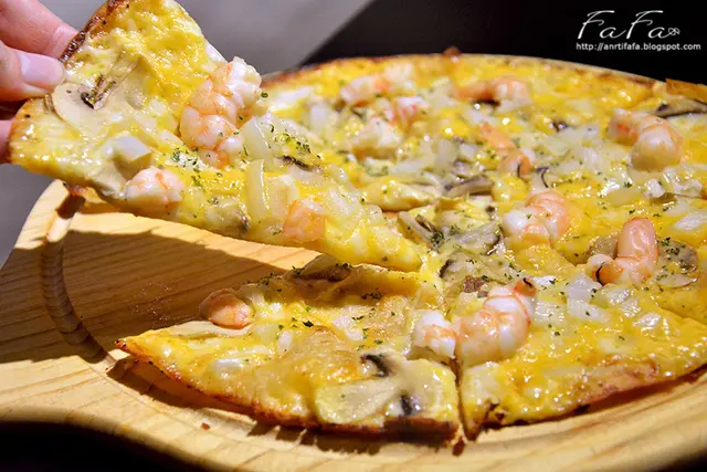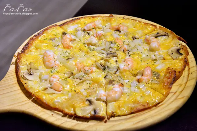 法式鄉村醬、蘑菇、洋蔥、鮮蝦、Jack Cheese、Cheddar Cheese、Parmesan cheese