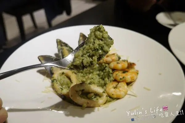 青醬香氣撲鼻而來,店家還特別保有蘿勒小碎葉,味道上更加香濃,每粒米都燉到入味,每口都是幸福,
