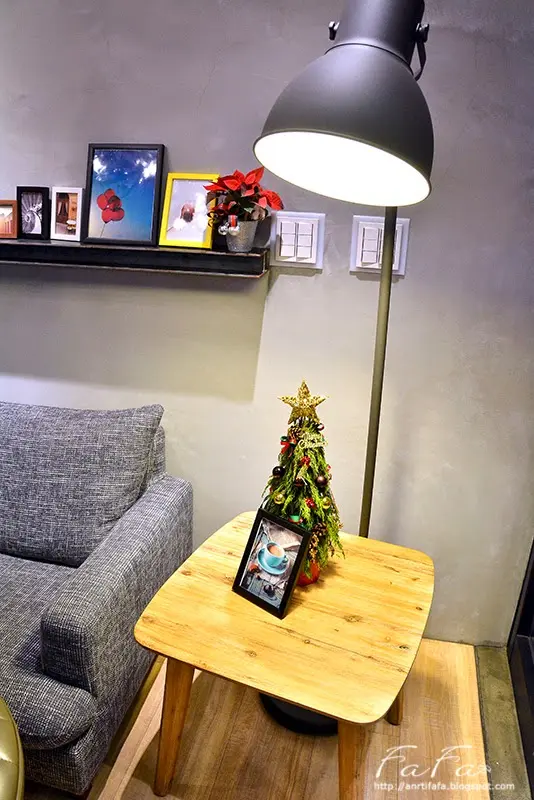 不只是外頭聖誕紅盆栽,裏頭木頭茶几也放上一顆可愛又優雅的聖誕樹。