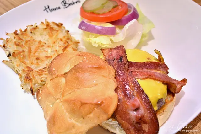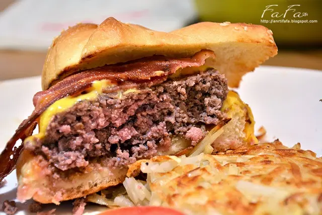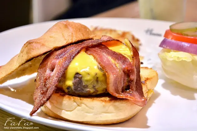 7oz純紐澳牛肉手工打製而成,再搭配交叉式脆箱培根片與鹹香較明顯的切達起司,