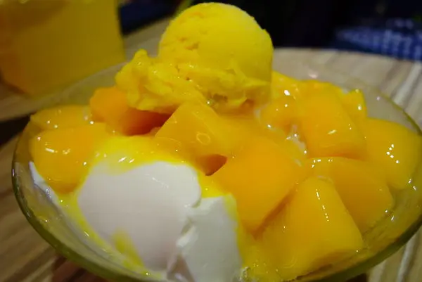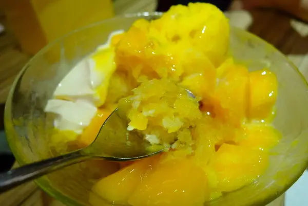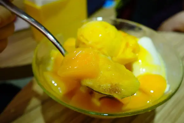 店內招牌一定要點一份來吃吃的 尤其現正是芒果產季 更不能錯過呀! 好吃的新鮮芒果冰 上面有一球芒果口味的冰淇淋和刨冰的口感完全不同 刨冰是有顆粒的口感 但卻不是那種咬不動的碎冰 而冰淇淋則是有點像在吃冰沙但卻比冰沙還要來的細緻 除此之外一旁還有店家自製的奶酪也非常的Q彈. 新鮮芒果撲滿了整碗冰 芒果切的又很大塊 入口整個爽度十足 不旦可以吃到新鮮芒果的鮮甜味 刨冰更是透心涼 忍不住不停的說~好好吃哦!