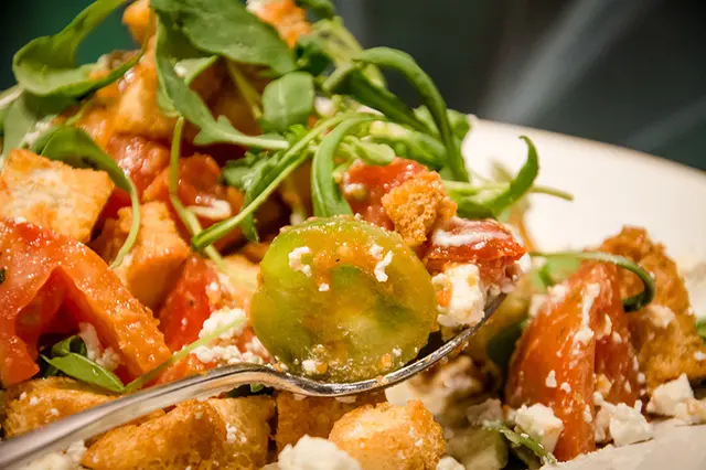 慢烤蕃茄、彩色番茄、瑞可達(Ricotta)與水牛起司(Mozzarella)、麵包丁、羅勒、松子、酥脆酸豆、芝麻葉