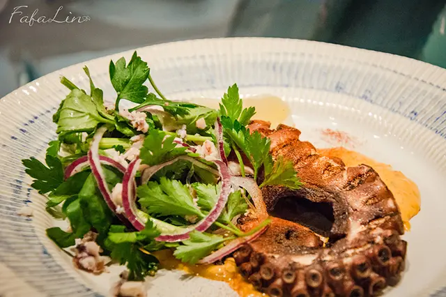 看到一條粗壯的完整章魚腳在盤子上倒是第一次,以往吃到的要不是切片就是切塊,整條上桌充滿霸氣。整隻章魚慢燉後在取出章魚腳放置烤盤煎至兩面焦香,搭配以豬腳與辣椒醃製而成的肉腸來製作的橘黃色美乃滋醬,如果單吃章魚可以吃到非常軟嫩的章魚口感以及濃厚炭烤香氣,沾上醬汁則變得絲滑帶點辣肉香。