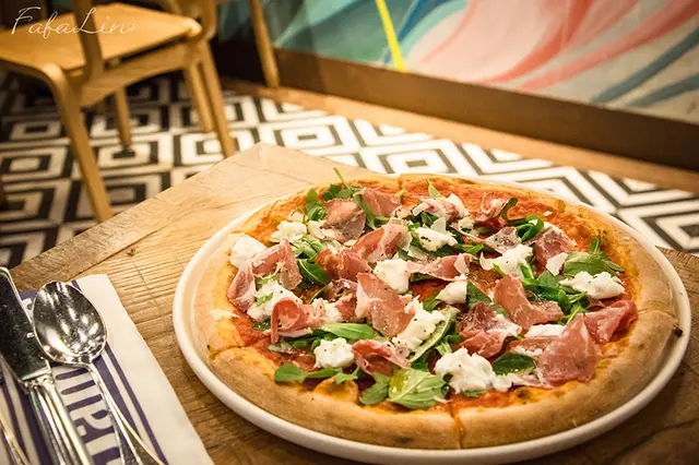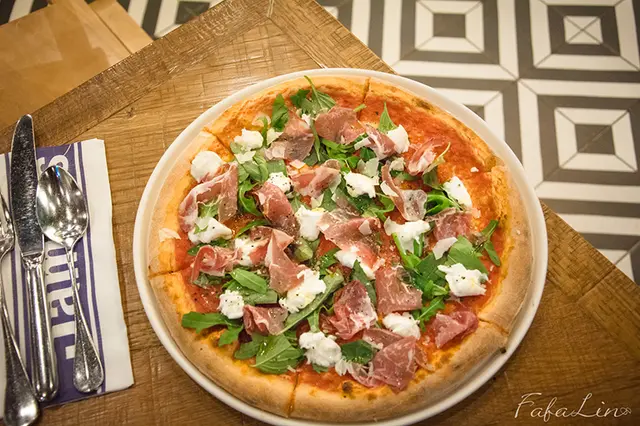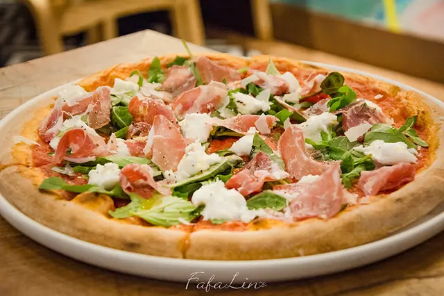 自製番茄泥為基底進入烤箱,出爐後加上火腿跟一口大小的Bocconcini水牛起司,與酸酸的番茄搭再一起非常合味,在咬到鹹口的濃香肉味衝擊之後,馬上迎來清香酸味與口感軟滑的乳香滋味,顏色風味恰到好處。