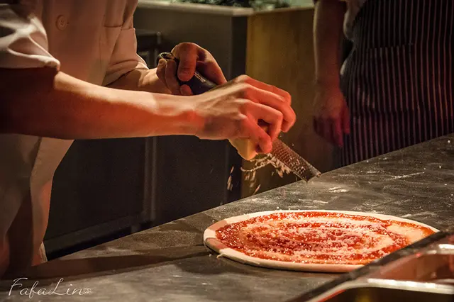 從現桿麵皮到抹上自製番茄醬,刨上起司絲、加料。