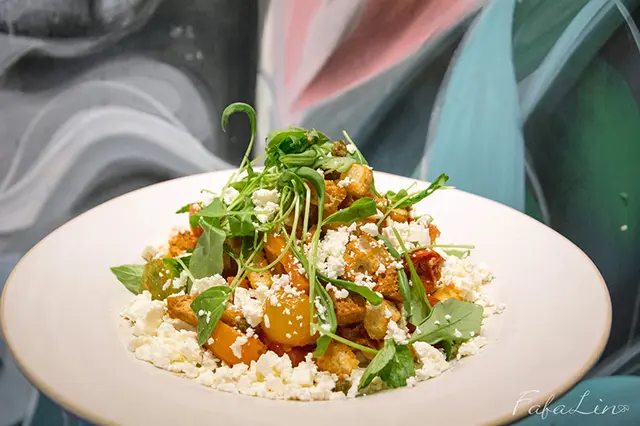 這道沙拉的番茄款式很多種,牛番茄、小黃番茄、季節性番茄等綜合番茄,就連醬汁也是用風乾的番茄來製作,被雪白色起司覆蓋的沙拉下,其實骨子裡都是番茄。風味精華之處在於吃的時候要與旁邊的起司一起入口,多汁清爽的香氣甜味分別從咬開的番茄汁液中流竄出來,適時加入起司的增添淡雅香氣及爽口度,吃到塊狀麵包丁還能帶來很有層次的酥脆感。羅勒與芝麻葉翠綠色彩除了讓沙拉顯得繽紛有朝氣,也有其淡雅香氣等著讓人咀嚼出來。番茄個個大約一口大小,很好入口,因為份量多的關係與人分食可以很方便不會搞得分不均勻。
