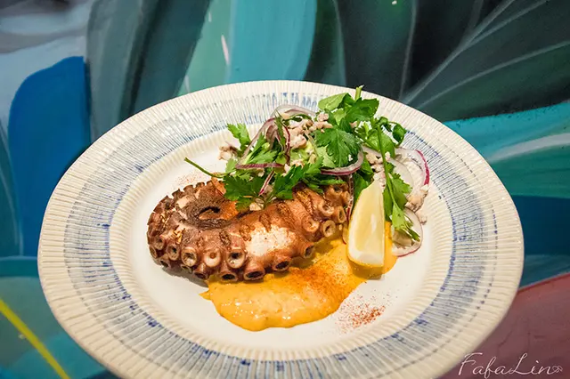 燉章魚、辣味肉腸醬、紅椒粉、歐芹、檸檬、水田芥、紅洋蔥