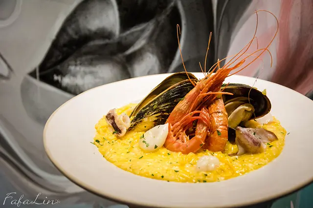 使用世界上最昂貴的香料番紅花所製作,搭配馬祖空運來台的淡菜以及紅潤大隻的胭脂蝦,馬祖淡菜吃起來軟嫩新鮮,沒什麼腥味,剝光蝦殼後蝦身蠻短小,但口感脆嫩,旁邊還有Q嫩的透抽與小花枝,這道風味不會過重,米粒保有米芯,咀嚼時淡雅的番紅花香氣以及奶滑感,這之中也能嚐到淡淡的檸檬清香。