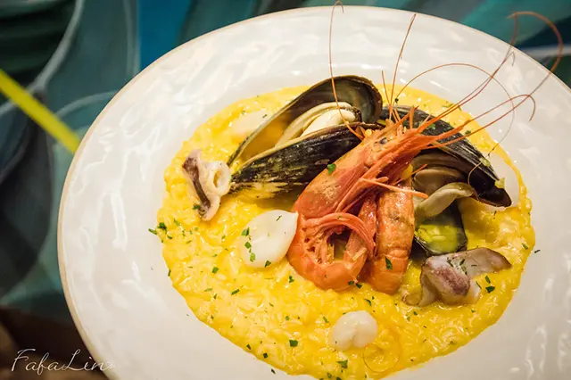 番紅花、馬祖淡菜、義大利米、甜蝦、透抽、檸檬、歐芹、奶油、鮮奶油
