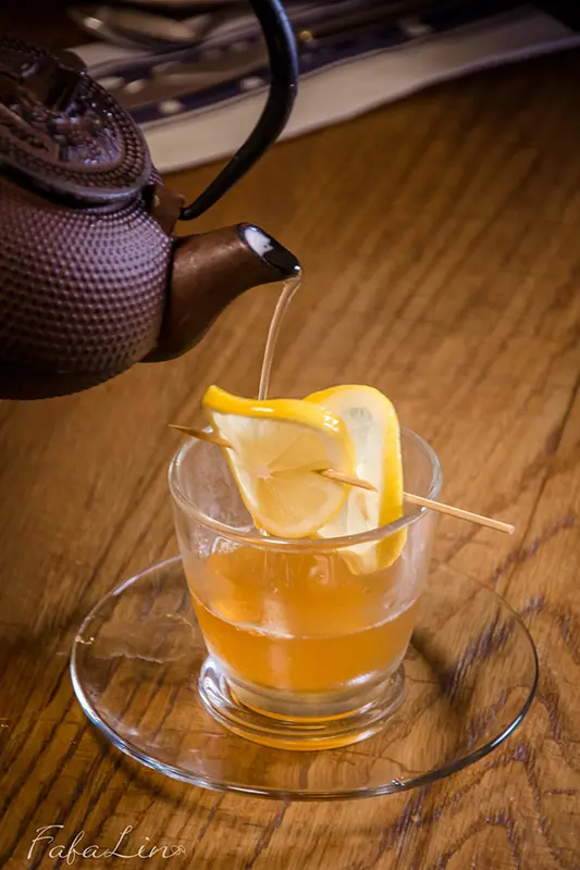 這道調酒在吉米精選之一,融合中國風格以茶壺的方式將酒液倒出,沖泡時順著兩片檸檬轉呀轉的流到杯子裡頭,將檸檬汁及香氣順勢帶入茶湯裡,喝起來淡淡茶香絲毫不覺酒精在內,清新風味很好喝。