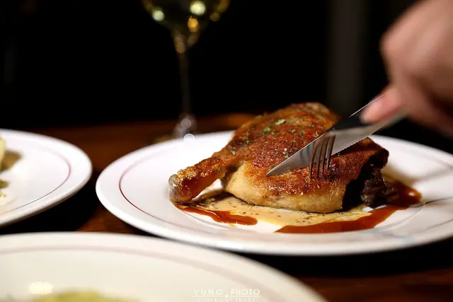 主廚使用油封技法 鴨腿醃製後 置於鴨油中 低溫烘烤數小時 這一過程使鴨腿肉質變得極其軟嫩
