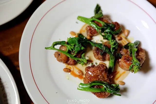 主廚將小牛胸腺煎至金黃酥脆 保留其內部的嫩滑口感 同時增添外層的脆感 吃起來相當美味