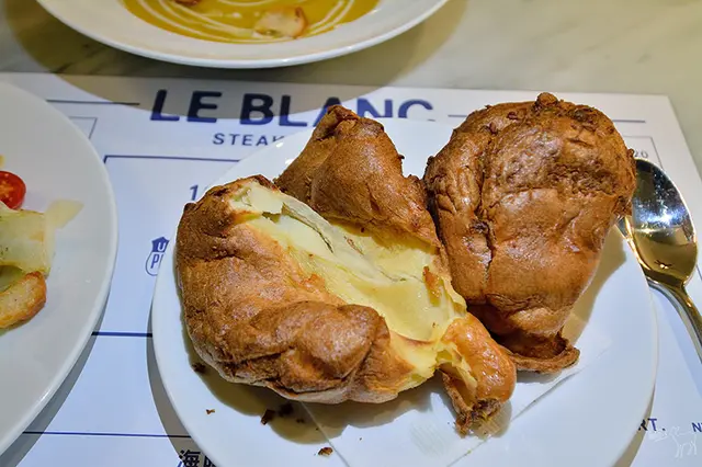 麵包很特別,是約克夏布丁麵包,撕開後會像左邊那塊的樣子,外皮是因炸過呈現的深褐色,裡面則是鵝黃色,口感外酥脆內Q軟,帶有點焦香味。