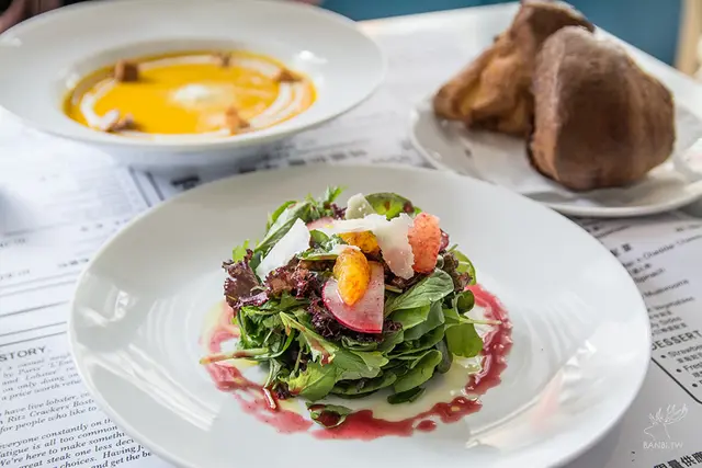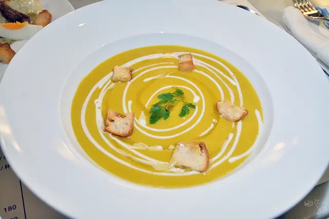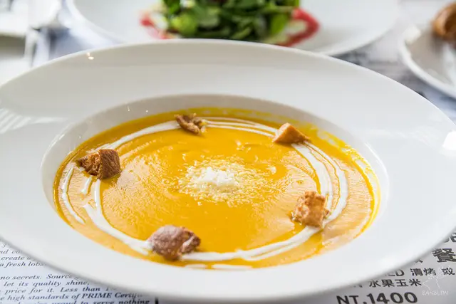 南瓜湯很香濃,還透著焦糖香氣,口感十分的細綿,上方還有酥脆的麵包丁,好喝極了!這真是近期以來喝到最喜歡的南瓜湯了!