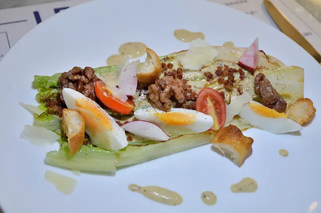 蘿蔓沙拉是將蘿蔓生菜稍為煎過,搭配櫻桃蘿蔔、培根碎、小番茄、水煮蛋、核桃(核桃我本身不大敢吃,但家人說有點焦糖香氣)、麵包丁,吃起來像是解構版的凱薩沙拉一樣,還不錯,可是我還是喜歡南瓜湯較多。