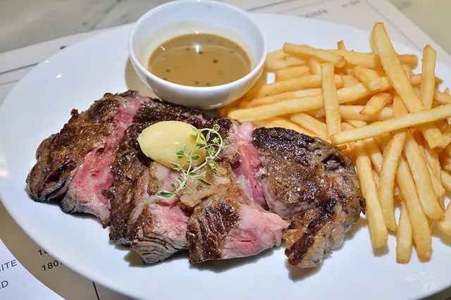 在像是荷蘭醬的經典貝亞恩醬汁、綠胡椒醬汁、辣根醬汁中,我們選擇了親切店員所推薦的綠胡椒醬汁,如她所說並不會辣,有牛骨汁與綠胡椒的香氣,挺不錯的。(後來二訪點了經典亞恩醬汁,也不錯!)