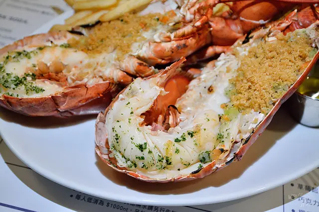 籠蝦可選擇蒸的(整隻下去蒸),或是烤的(會將龍蝦頗半後烤),我們選了烤的龍蝦。(還記得在透過電話訂位時,當時接聽的女店員很貼心的詢問是否需要幫忙預留龍蝦)