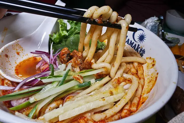 Asam 是酸的意思, 所以這是酸辣湯頭的麵, 我覺得這應該算Penang Laksa , (檳城叻沙) 因為用了比較多的蝦膏