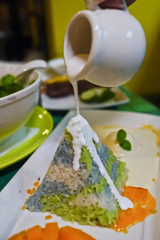 三色糯米是用了斑斕葉和蝶豆花作成, 然後還加了椰奶