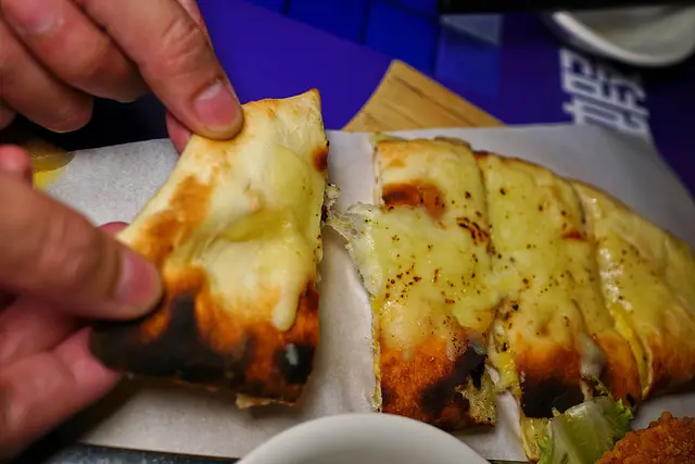 每日現擀的麵糰中包入兩種嚴選的起司,放進馬來西亞訂製的囊爐中,經過400度的高溫烘烤,烤出鹹香Q軟的起司囊餅