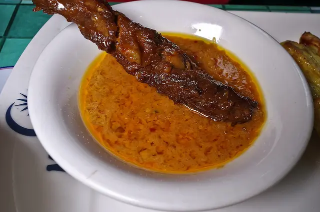 湯底是用魚熬出來的, 加上許多香料, 如叻沙葉, 酸味是用羅望子和亞參果片作成