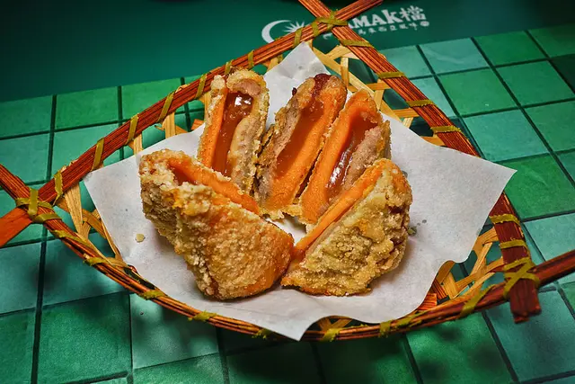 芋泥加上地瓜泥然後中間放上年糕炸過