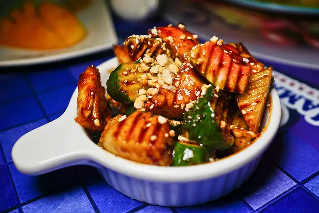 標準的紅綠醬汁已經淋好在雞肉上