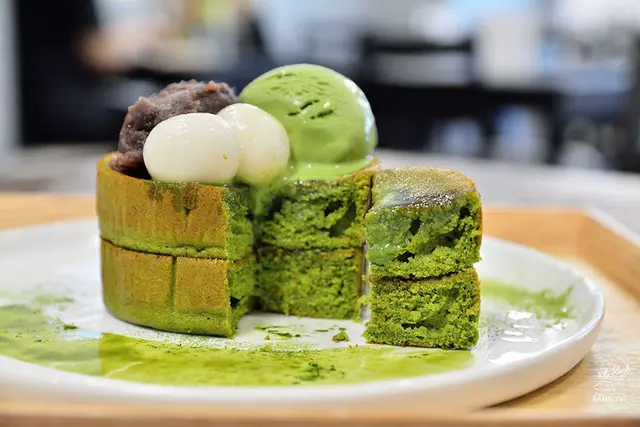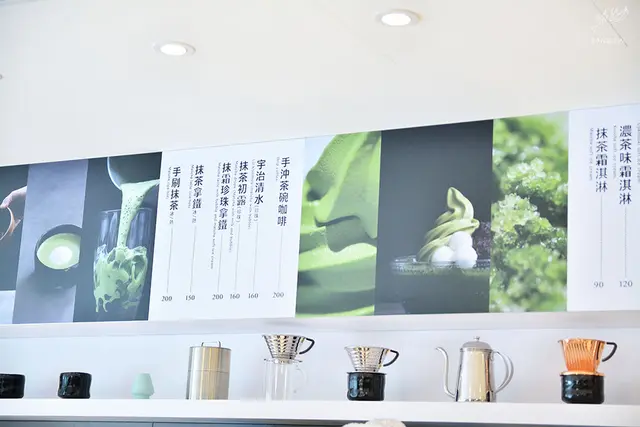 有抹茶霜淇淋、宇治金時、抹茶千層蛋糕、抹茶鬆餅與焙茶類的飲品、甜點。