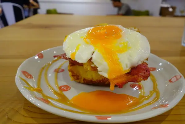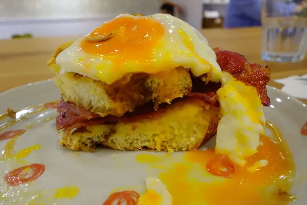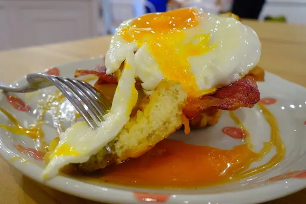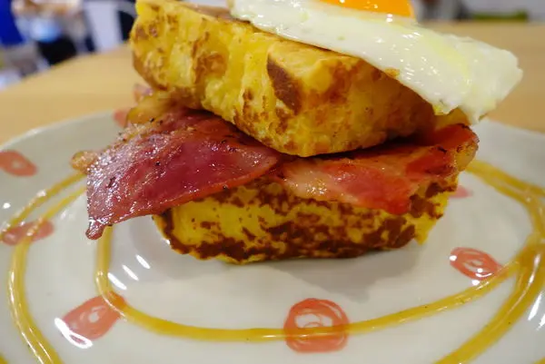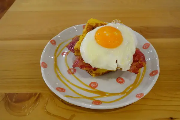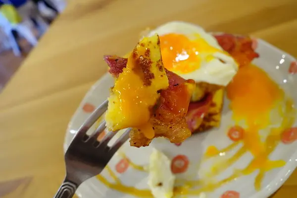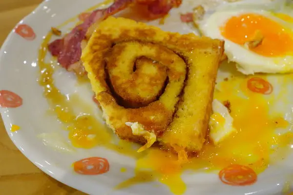 現點現做 請耐心等待! 一人吃一份剛剛好 端上桌香氣四溢 有著法式吐司的香氣 還有肉桂的香味 準備開動 好幸福哦 劃開太陽蛋 蛋黃的香味就散發出來了 沾著鬆軟的法式吐司 太美味了啦 肉桂的味道沒有我想像中的可怕 它獨特的香氣可是一直在我口中徘徊著 培根帶著點焦香味 下刀要切時覺得有點硬帶點乾 不過並不影響我對整體的喜愛 但還是建議要趁熱吃哦!