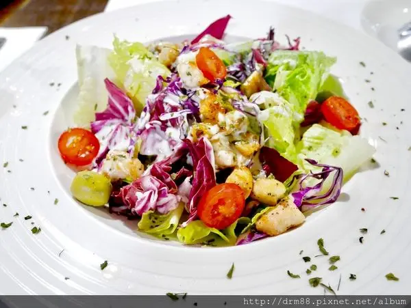 好大一盤的沙拉,這沙拉裡雞胸切成塊狀,一開始我以為那一塊塊的是吐司丁,