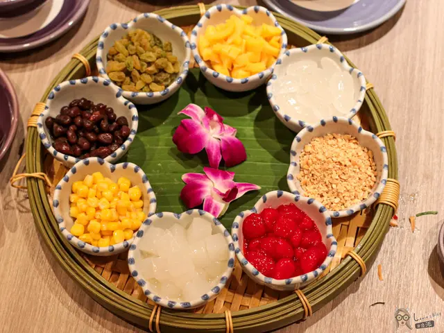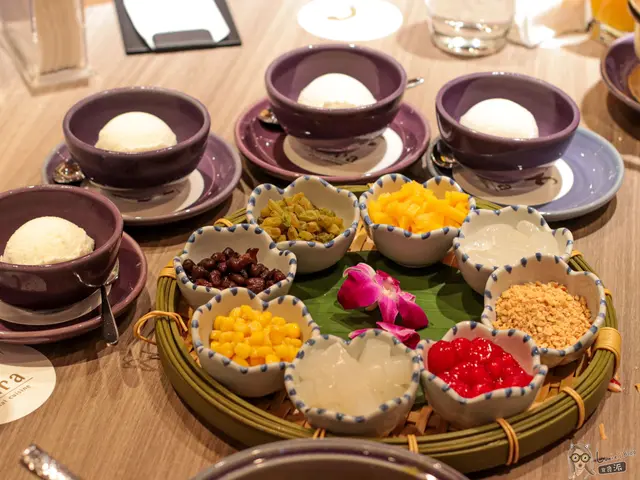 一份是四球椰子冰淇淋(可再加點),有玉米、葡萄乾、花生碎等等共八種配料,想吃什麼料自己加,史上顏值最高的泰式甜點!