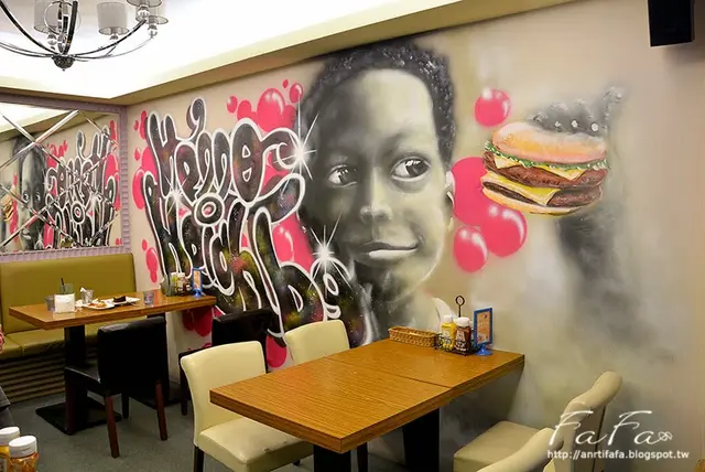 這面塗鴉牆不但有著表情動容的黑人小孩,重點是那栩栩如生的漢堡,