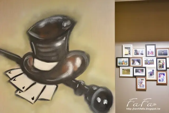 再來就是賞心悅目的逗趣廁所塗鴉牆,男士的紳士帽、手杖以及樸克牌,