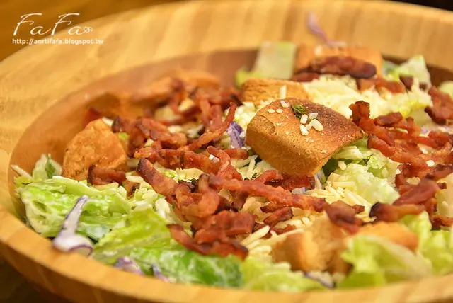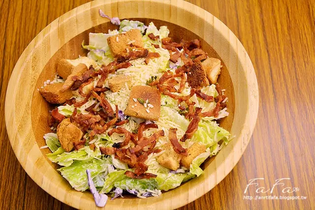 內容物有: 蘿蔓、紫高麗菜絲、培根絲、帕馬森起司、麵包丁、凱薩醬