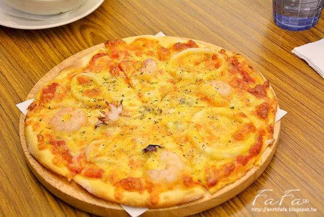這款披薩材料豐富,看著那一圈一圈的花枝、蝦仁個頭都不小,