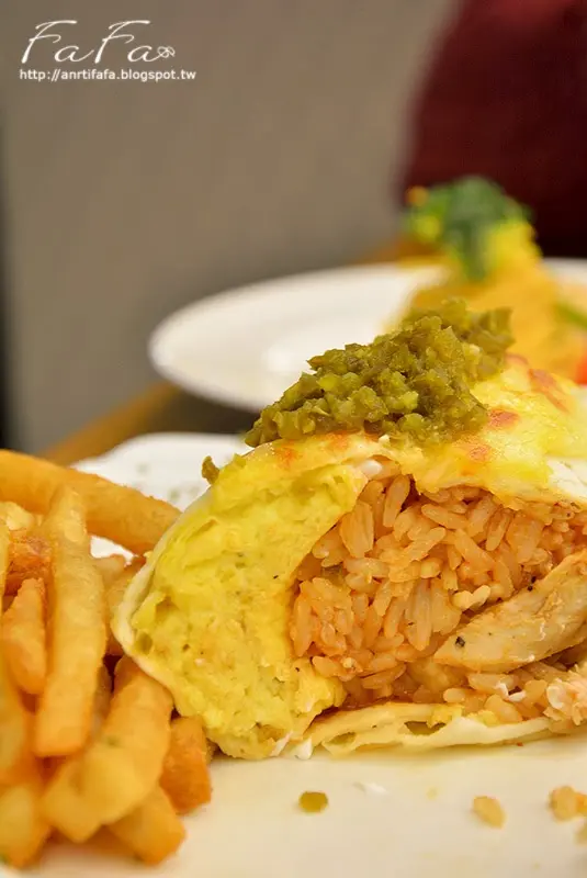 捲餅上頭還有烤的焦黃起司與醃黃瓜碎粒,特別妝點美化後的墨西哥捲餅挺討喜。