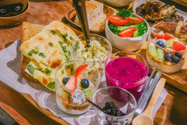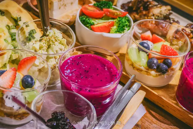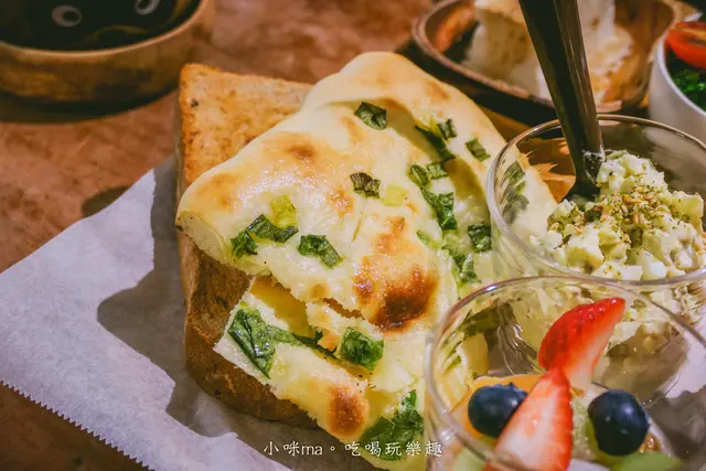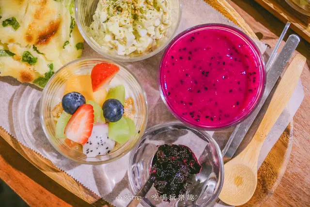 本來想說點的麵包套餐墊胃,因為我還想吃甜點,結果一上來是這麼大一份,瞬間就飽了,這個麵包套餐有佛卡夏麵包、烤土司、水果優格、果醬、新鮮果汁、蛋沙拉,這樣一個SET真的可以吃很飽,而且食物原料都是新鮮食材製作,這樣一份160元是很值得的喔