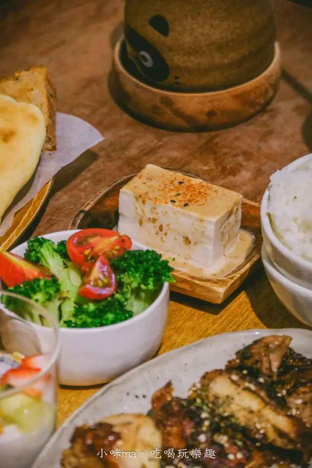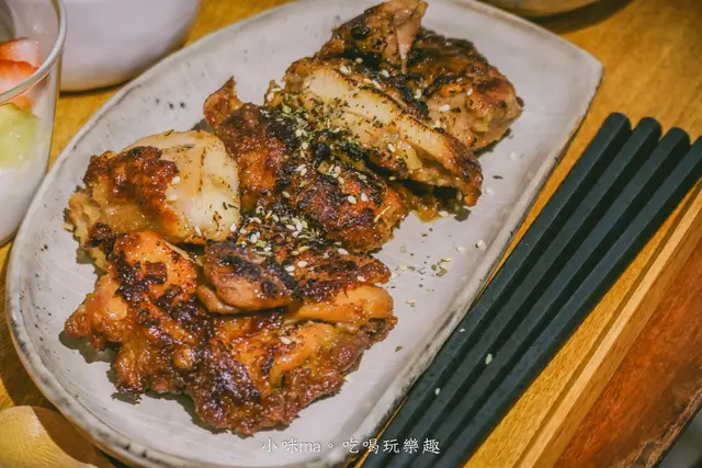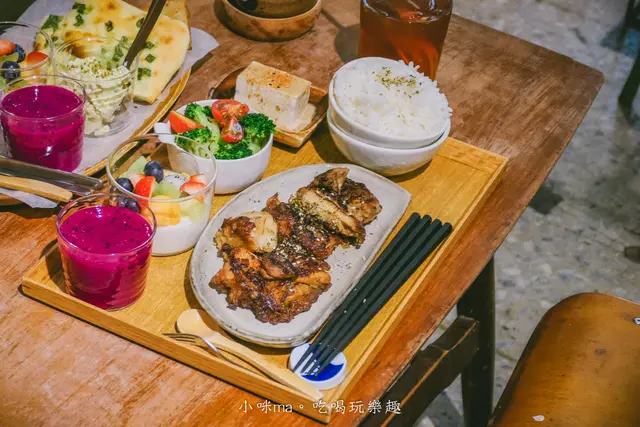 店員超貼心的,聽到我們點餐討論要一起share吃,上餐的時候直接給我們兩副碗筷,太sweet了,香烤雞腿排附上涼拌小菜、青菜、水果優格、新鮮果汁,一上桌就可以聞到香料誘人的香氣