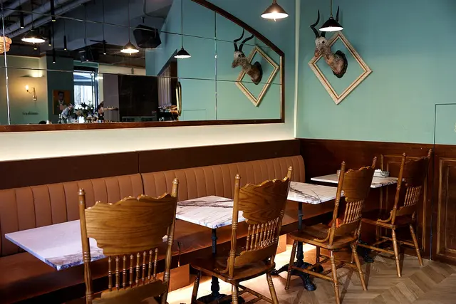 提升了空間的通透感 牆上懸掛的動物頭裝飾框 展現了歐洲狩獵風格的獨特魅力 褐色的皮革長椅與木質餐椅