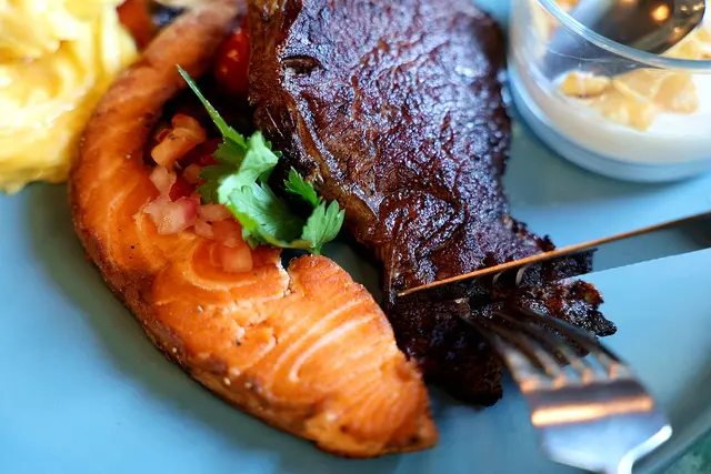 包含6oz沙朗牛排&鮭魚 生菜沙拉、起司蛋捲/松露炒蛋、核桃麵包