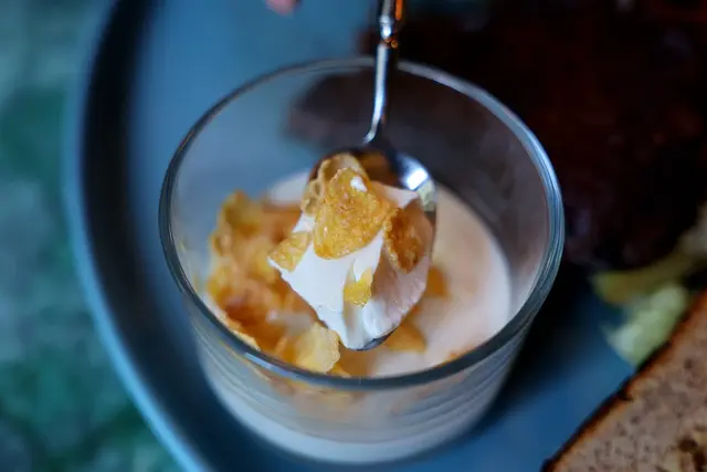 濃郁綿密的奶酪中加入了脆口玉米片 既是主餐的結尾 又為整體提供了一絲清新的甜點感