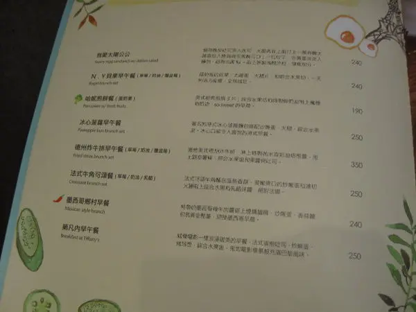 菜單裡有全日提供的三明治.漢堡.早午餐.中午開始也提供午餐.義大利麵.燉飯等,另外也有沙拉.開胃菜.鬆餅.甜點.飲料等選項,菜單相當豐富,今天主要是來吃早午餐,光早午餐也有近20種的選擇,我選了法式牛角可頌餐(250元)~