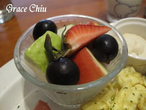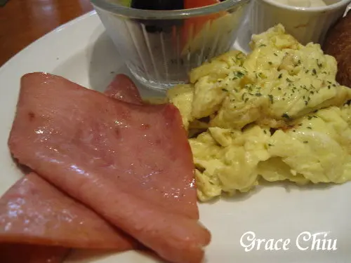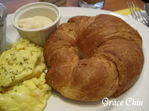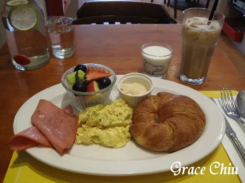 法式牛角可頌餐(抹醬為草莓/奶油/乳酪三選一,我選乳酪),內容有法式牛角可頌麵包.新鮮水果.火腿片.蛋&二杯飲品.