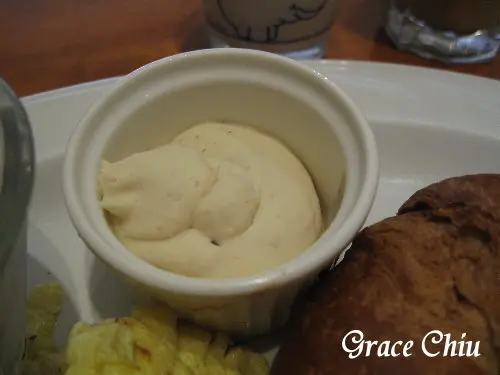 本次主角~法式牛角可頌,個頭比外面麵包店的還要來的大,有著酥脆的外層加上鬆軟內層,咬下去口感層次分明,嘴裡奶油味飄香,詢問服務人員附上的乳酪抹醬為核桃乳酪,個人很喜歡這款味道細緻不甜膩的抹醬.