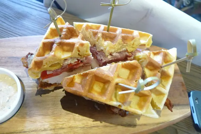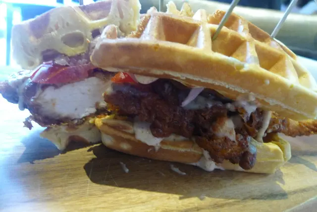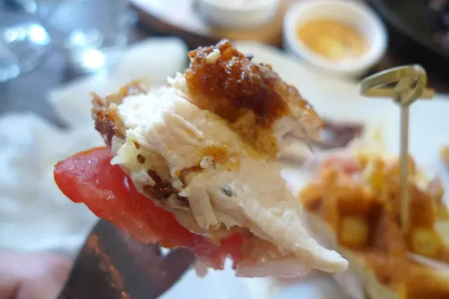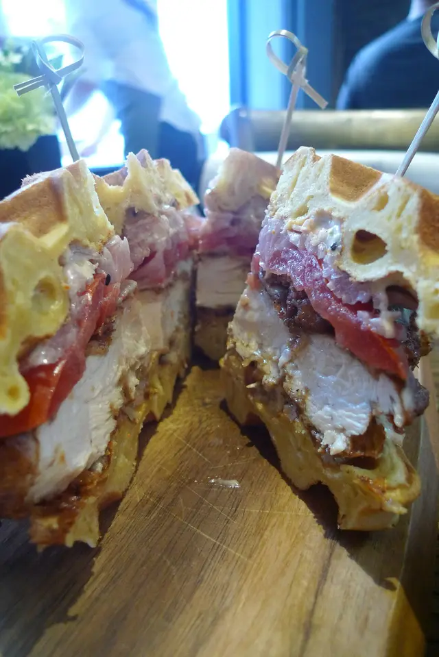 創意無限的主廚先以扎實的鬆餅取代傳統吐司當外層 內餡在夾上超大雞胸肉
