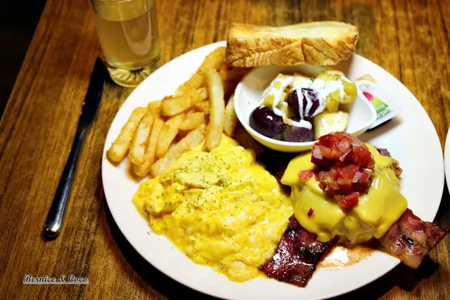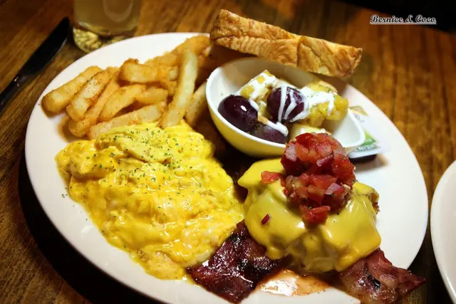 薯條、水果、山形吐司、炒嫩蛋、培根、牛肉、起司、風味番茄丁